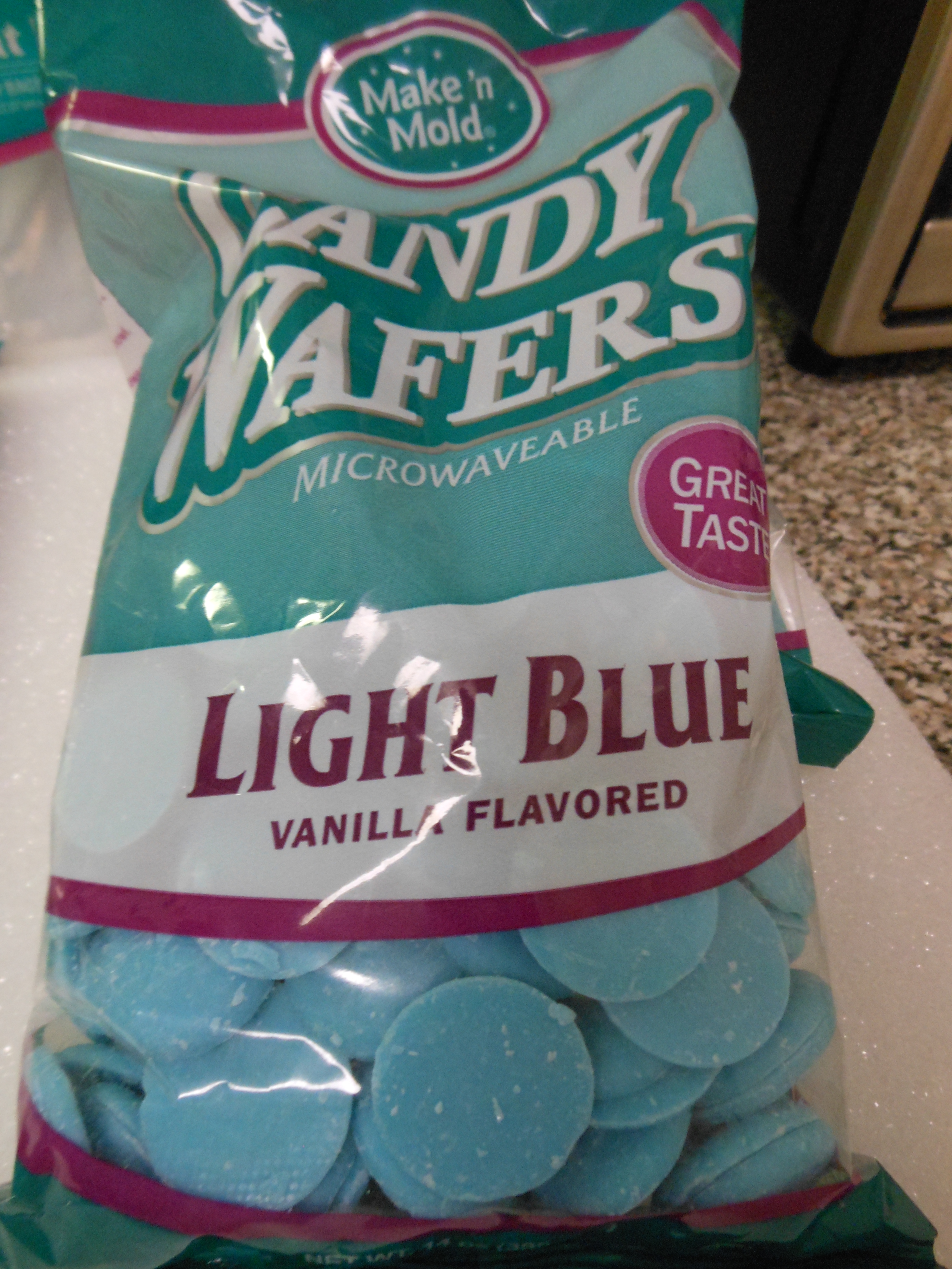 Next, melt your chosen colored candy pieces according to the directions. I originally was going to get the white candy and find some blue/green dye and attempt to make a Tiffany Blue, but decided that my supplies were getting a little costly. So I settled for baby blue candy that was just as fine.