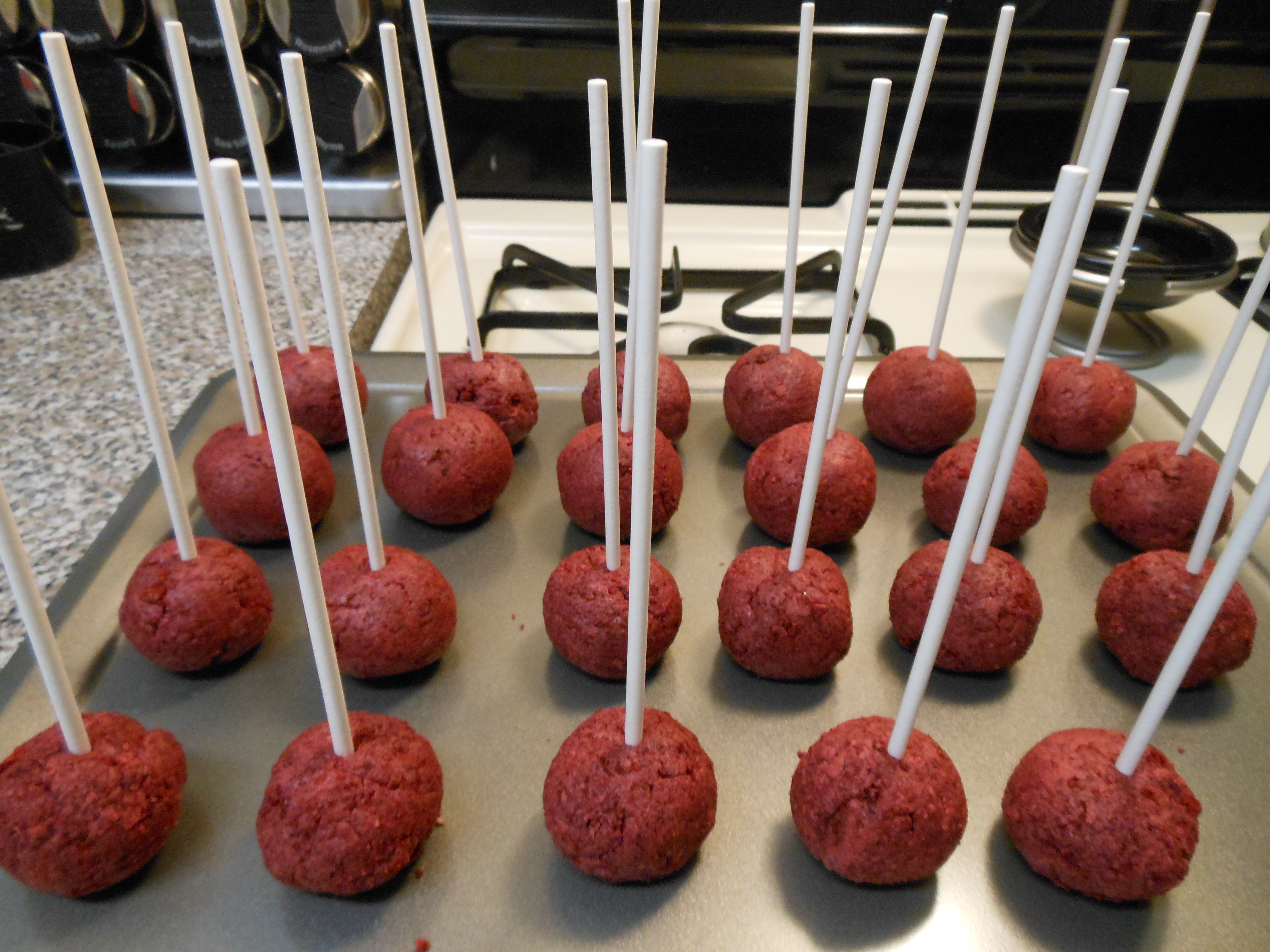 Prepare cake mix as instructed on the box and bake. Let cake cool completely when done. Since I was pressed for time, I stuck mine in the freezer until it was cool. Next, crumble cake into large mixing bowl. Then mix entire frosting tub into cake crumble. Stick bowl in the refrigerator for 15 minutes. I actually stuck mine in the freezer for about 8 minutes. Roll mix into balls, smaller than golf ball size and put on a cookie sheet or pan then put pop sticks in the middle. If they’re too big, they may fall off the stick later. The recipe I found says to stick the pops in the refrigerator for three hours (not gonna happen…). I stuck mine in the freezer for an hour and that seemed to be just fine.