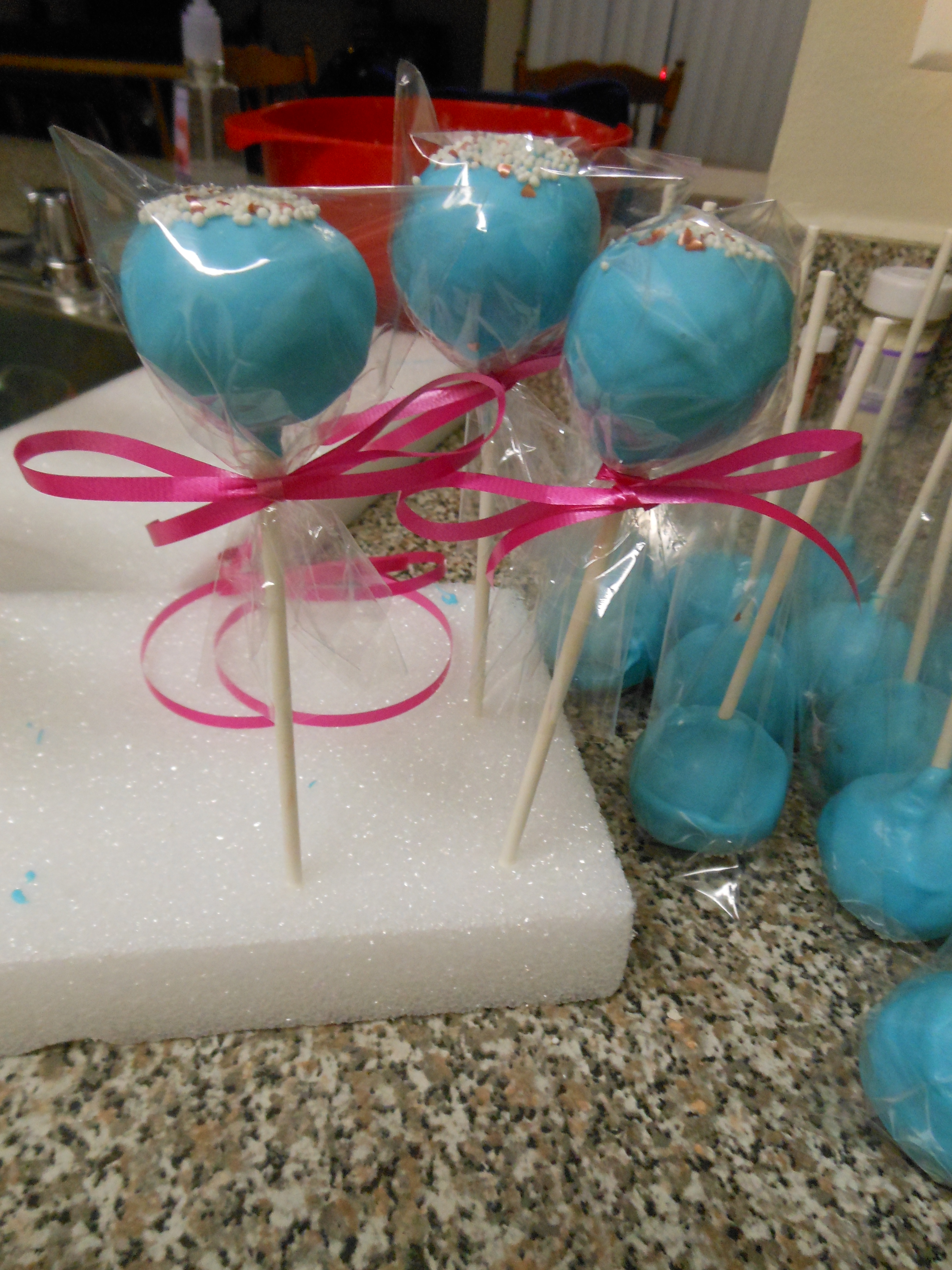 I loved the final product! I put them in little bags (found the smallest bags possible and put one cake pop in each) and tied a pink ribbon around it to keep it closed.