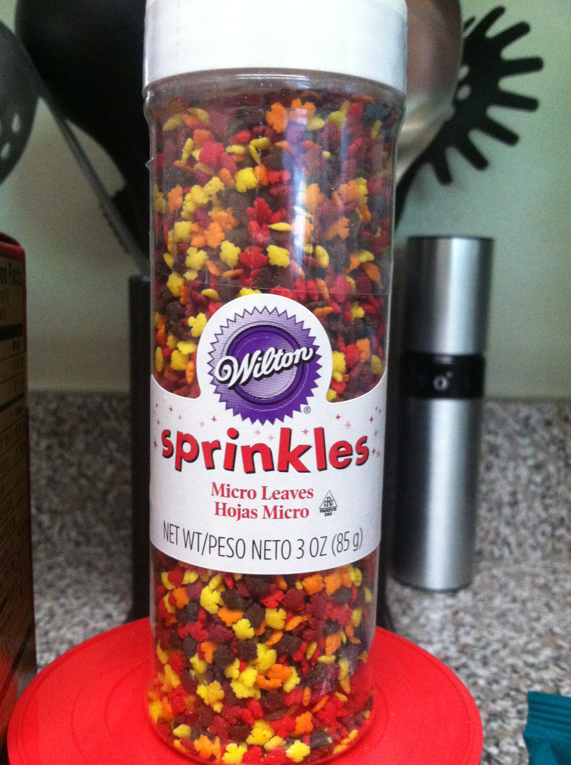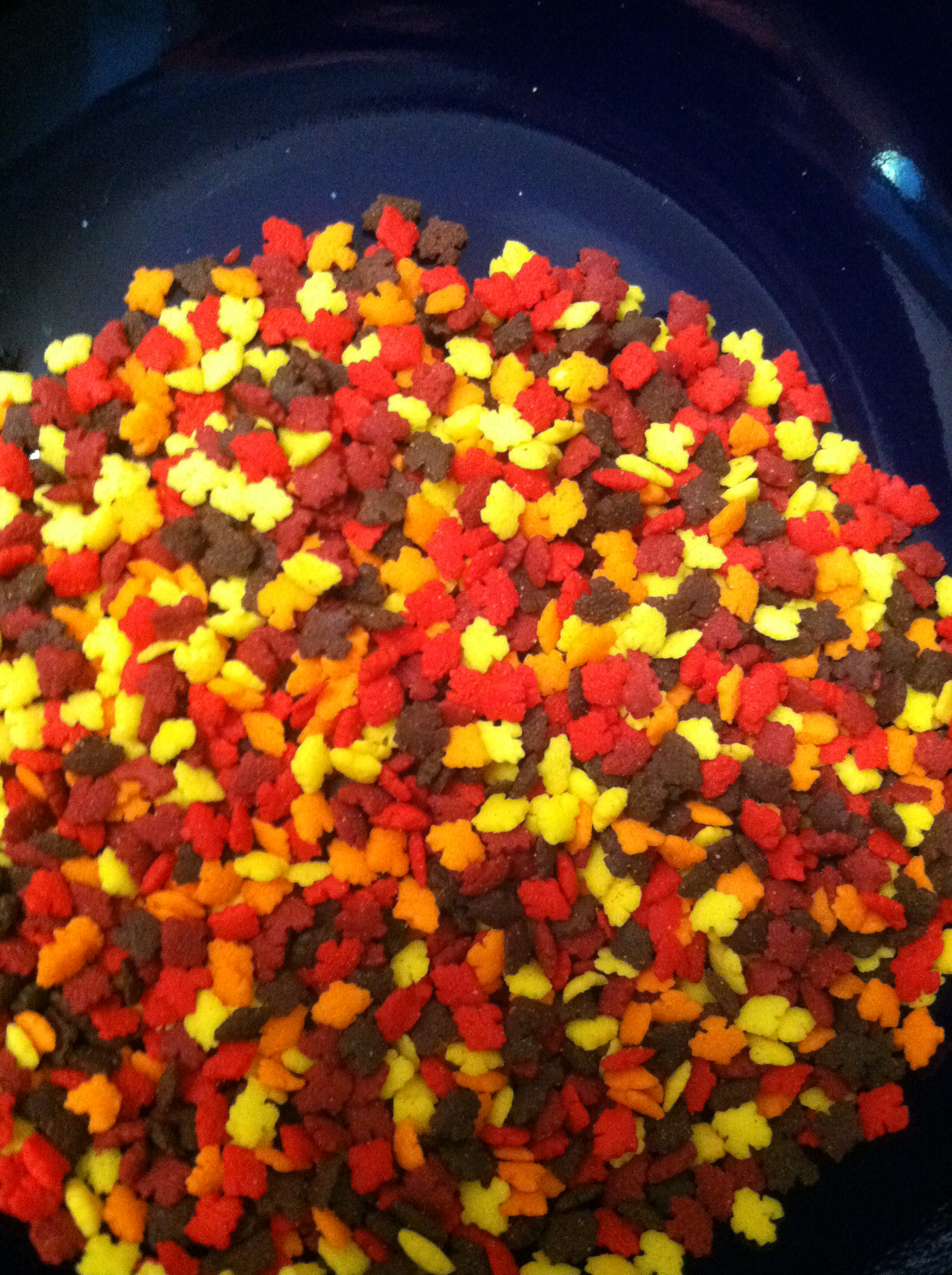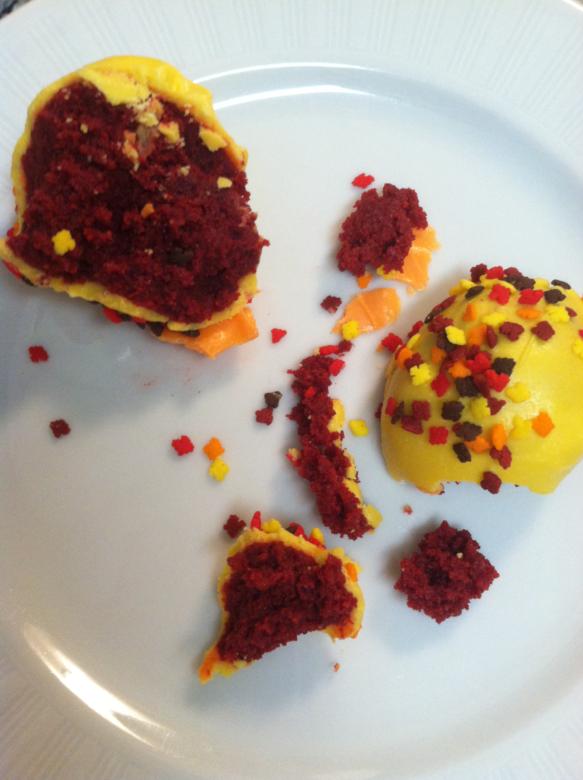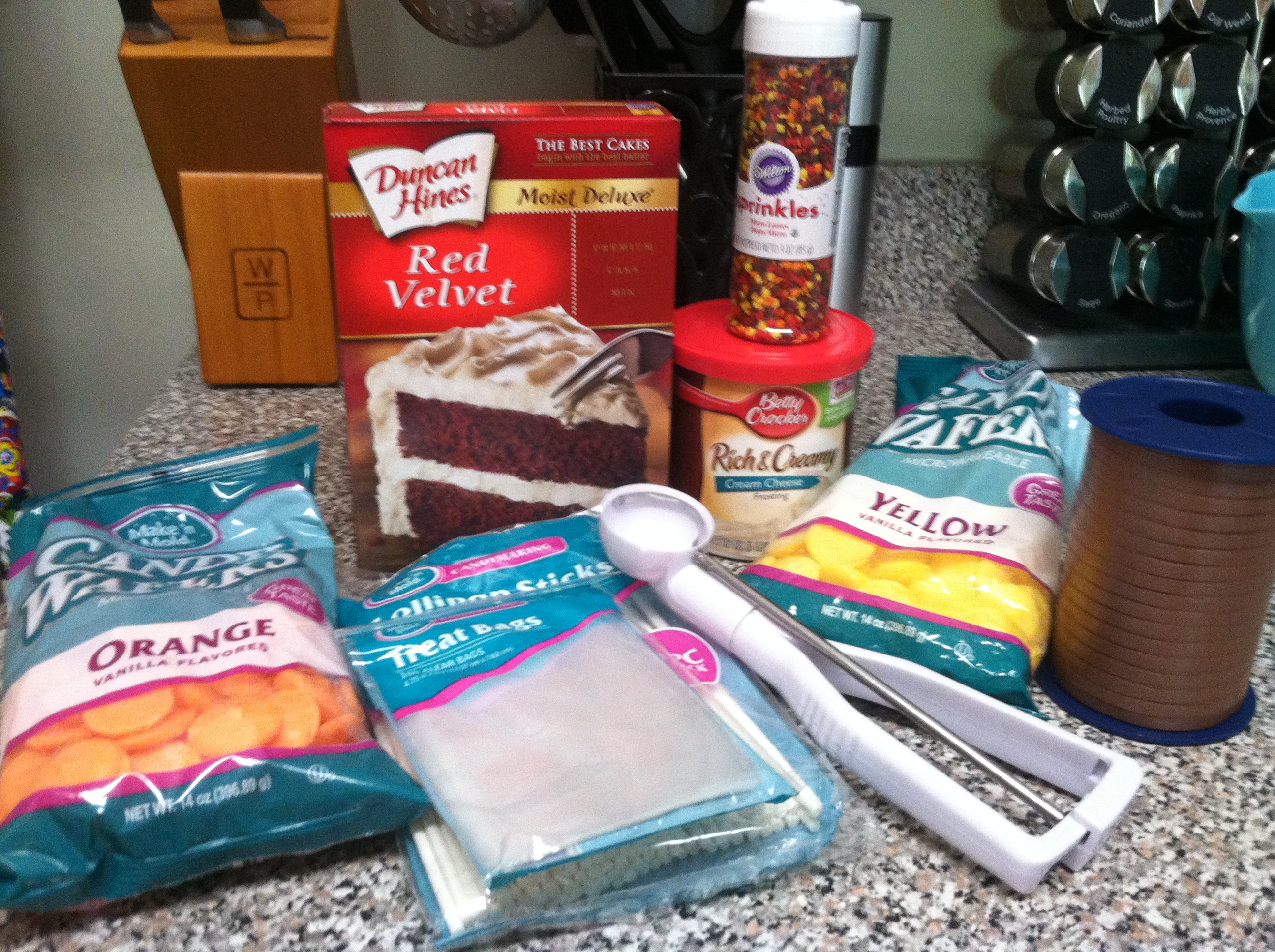 I used Red Velvet cake mix, orange and yellow candy wafers, brown ribbon, and the best part – leaf sprinkles!