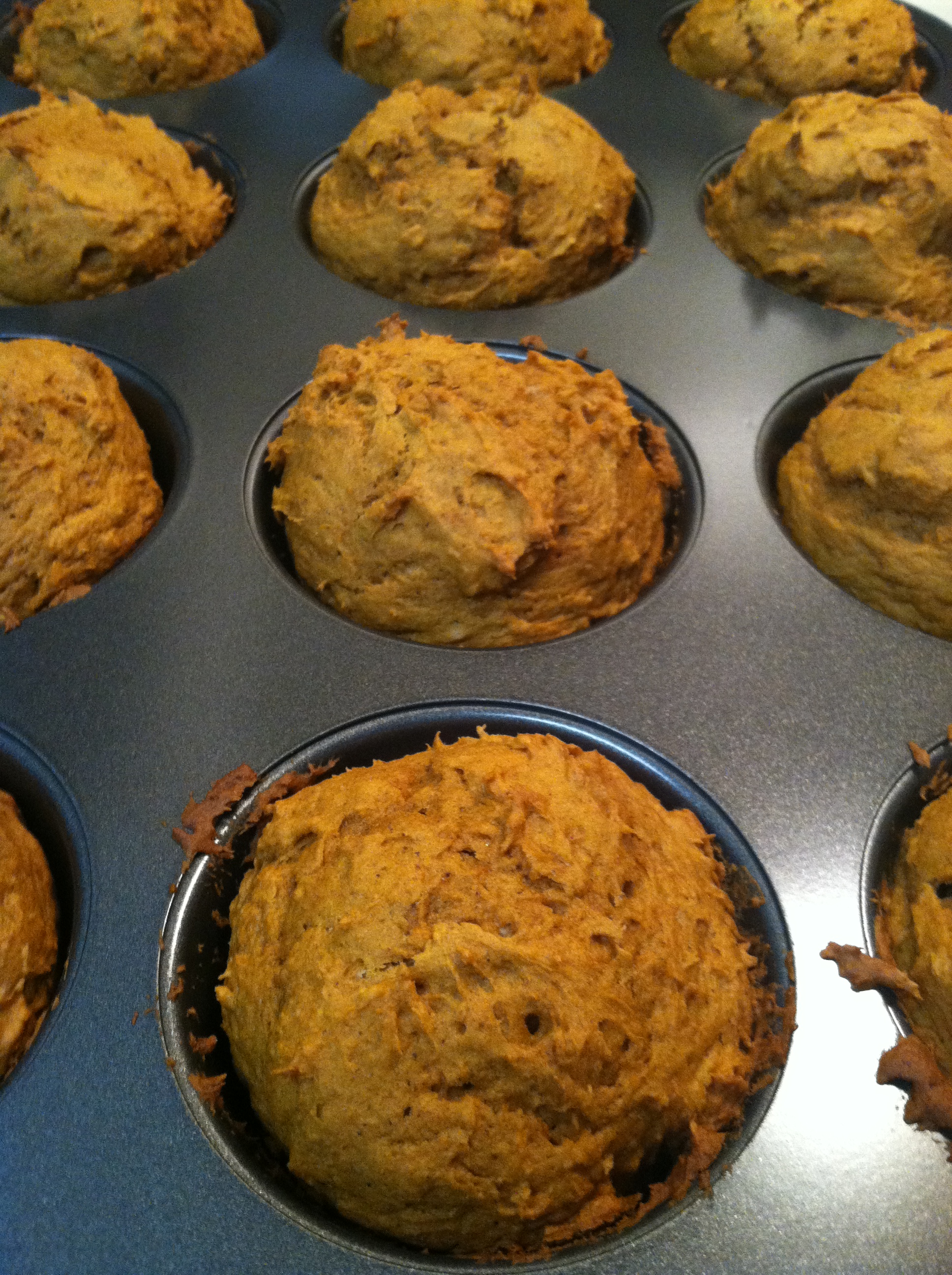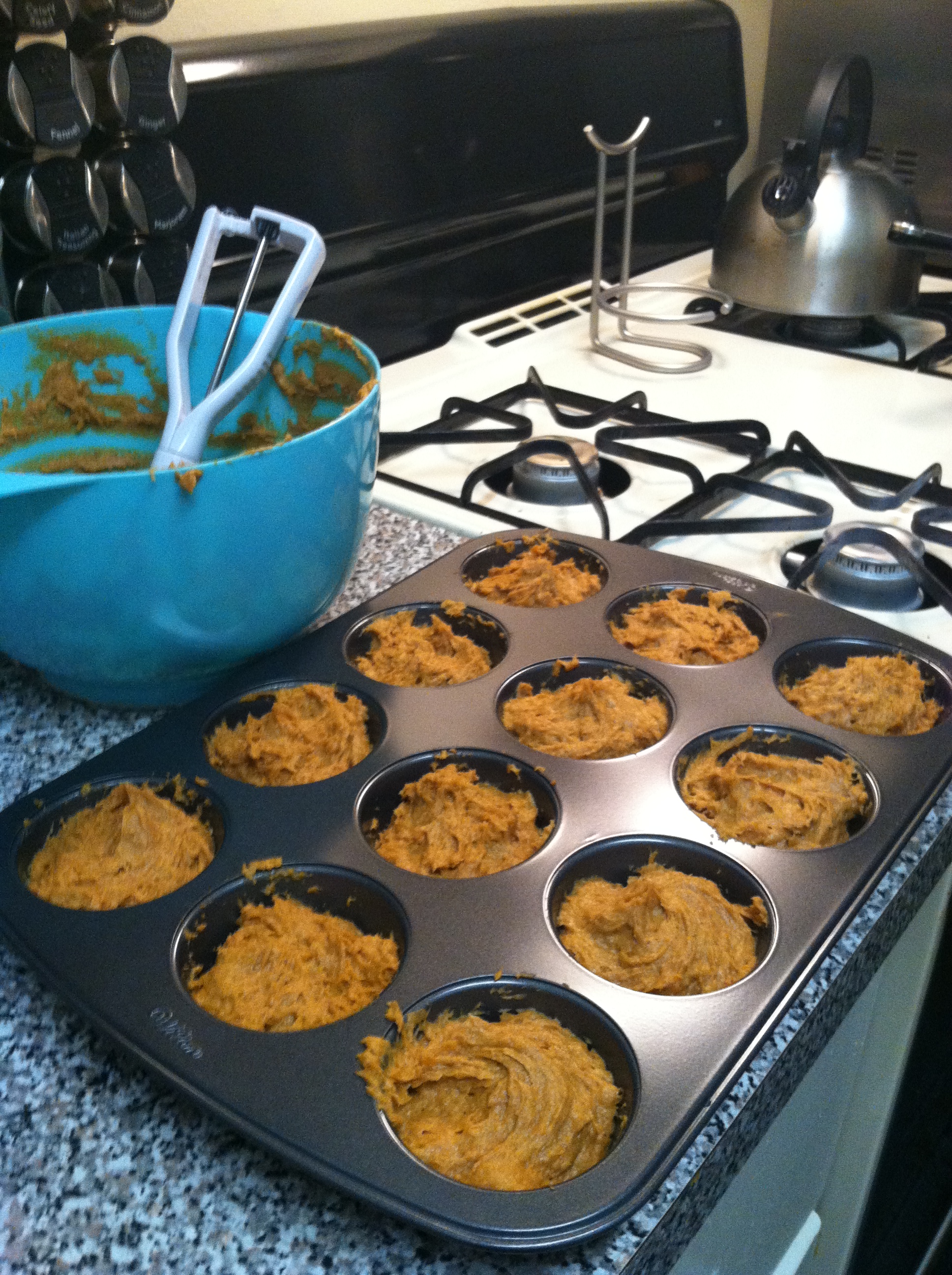 Preheat oven to 350. Mix your cake mix and pumpkin puree thoroughly. Scoop batter into pan (don’t forget to grease unless you have a non-stick pan). I also used a small ice cream scoop to fill mine up. Bake in the oven for 25 mintues.