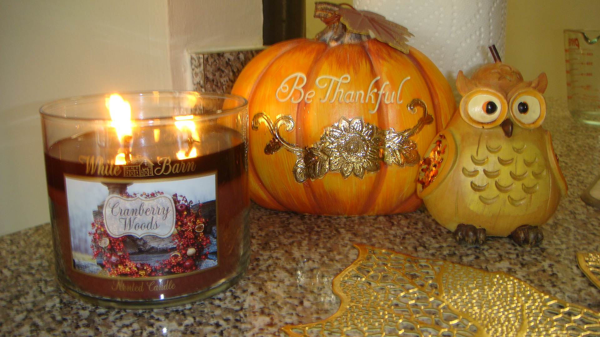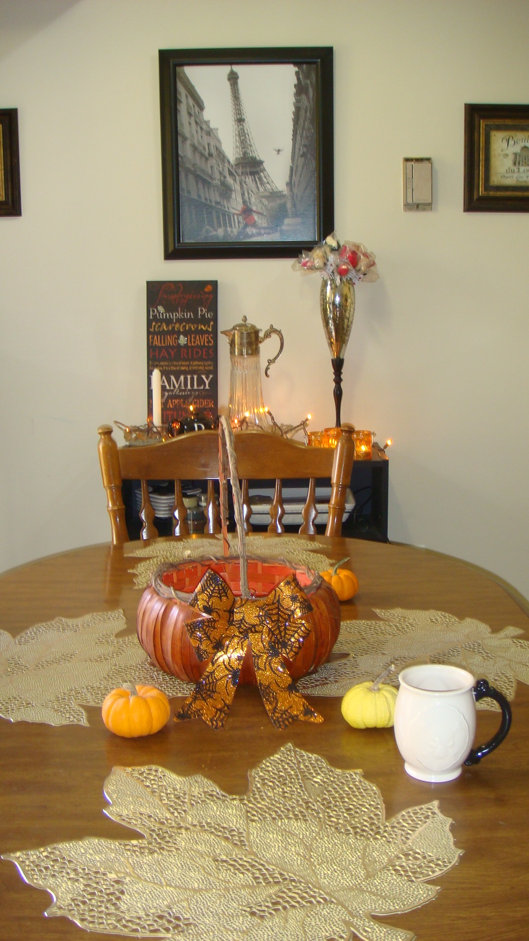DSC03768Fall signage by Kirkland’s. Fall colored lights by A.C. Moore. Orange tea light holders by Yankee Candle. DSC03770Owl, Be Thankful sign, and Happy Harvest sign gifted by my Aunt (thank you!).DSC03772DSC03773Harvest Blessings by Kirkland’sDSC03775Pumpkin basket and spider bow by A.C. Moore. Halloween mug by Target.