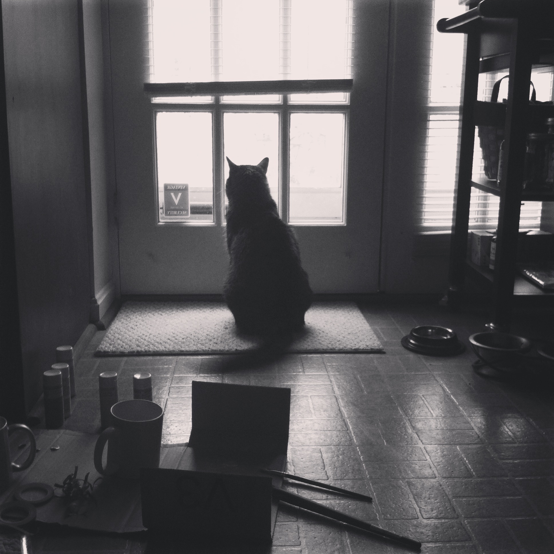 {Here’s our cat, Lucky, yesterday either bird watching our waiting for the snow. We knew it was coming despite the warmer weather!}