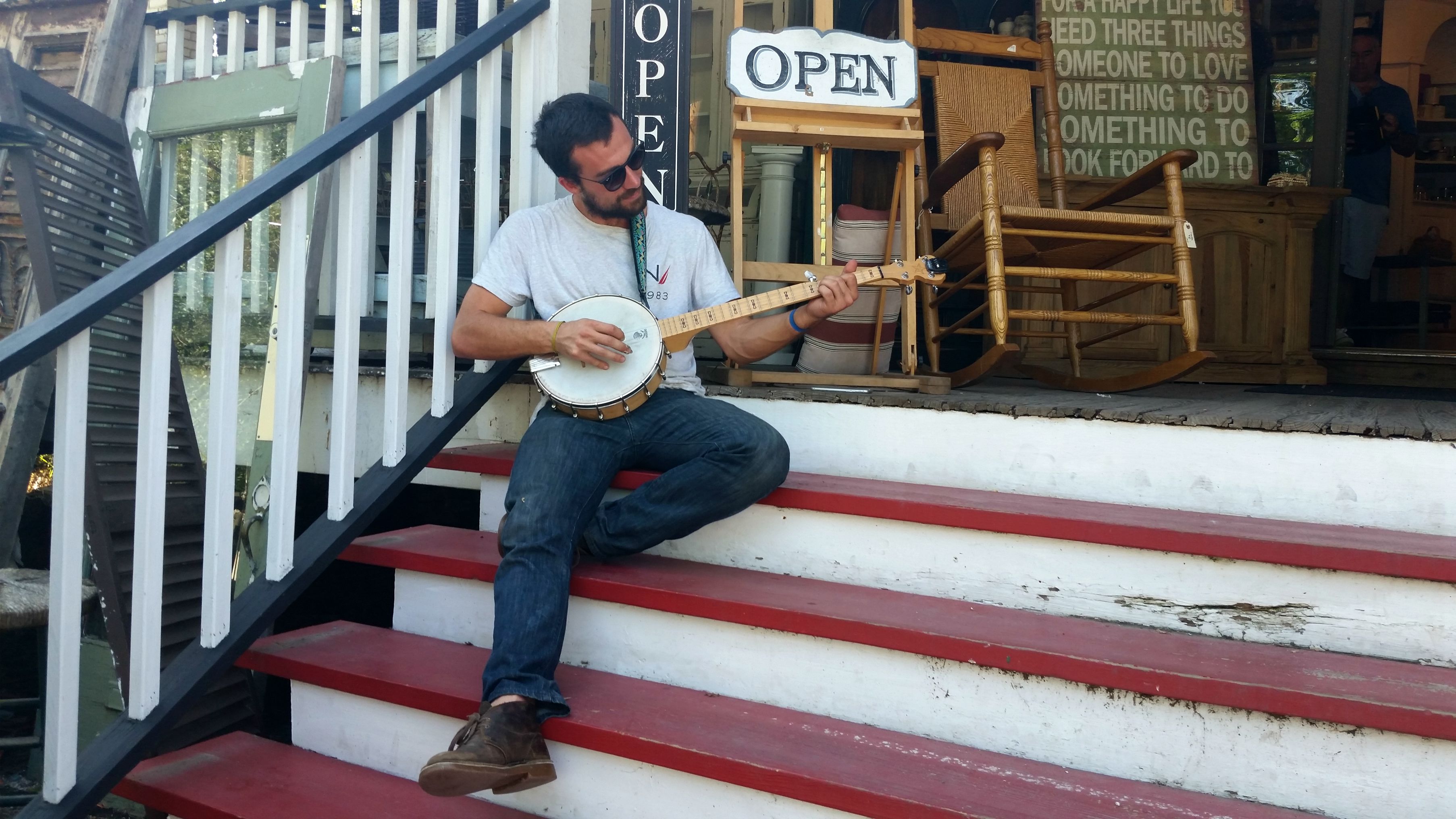 The soft sound of a banjo played on while we had been looking around outside. We didn’t realize at first that it was this guy who was playing! He looked pretty relaxed and cool while sitting there, and he was kind enough to let me take his picture.