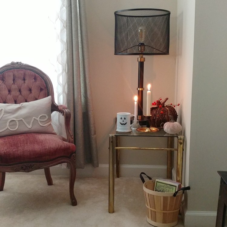 We brought back out the checked blanket and plump pillow to the chair this year and we added a new Autumn sign on the wall behind it!